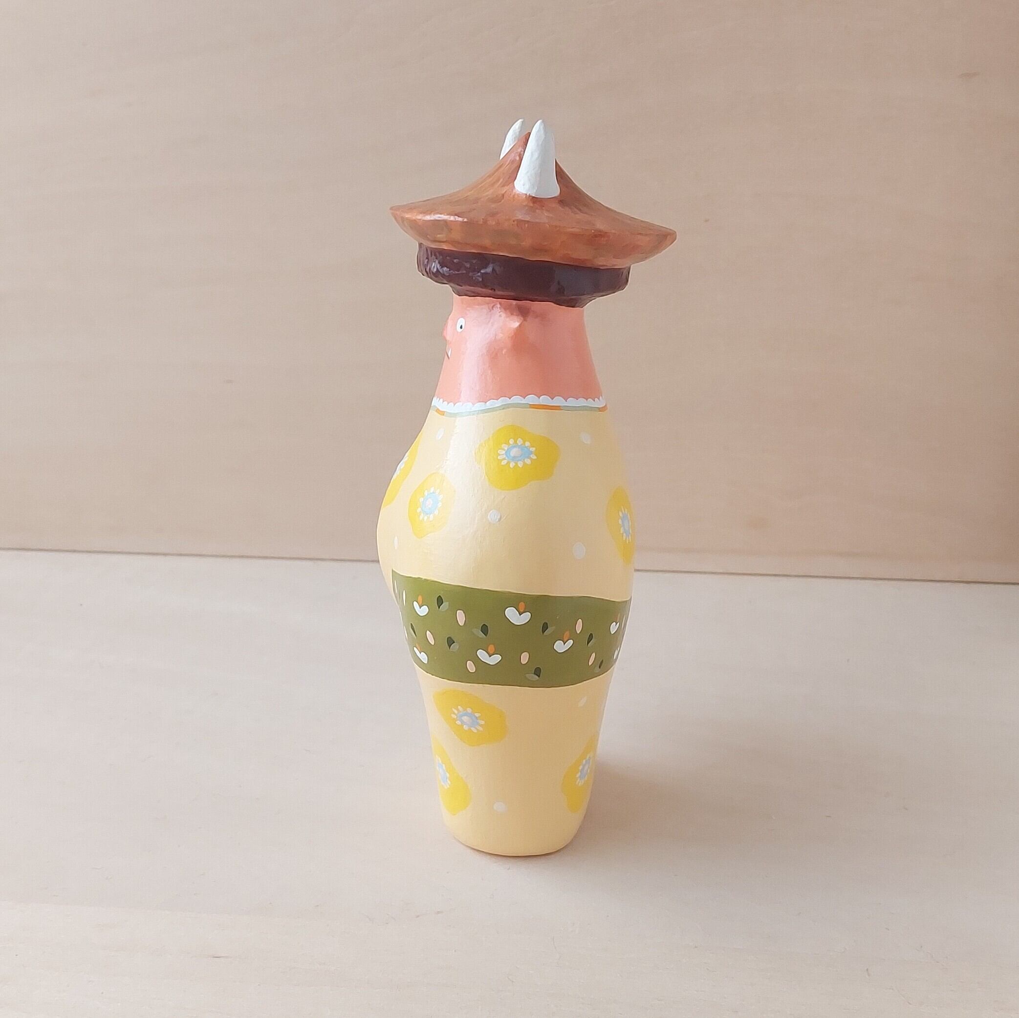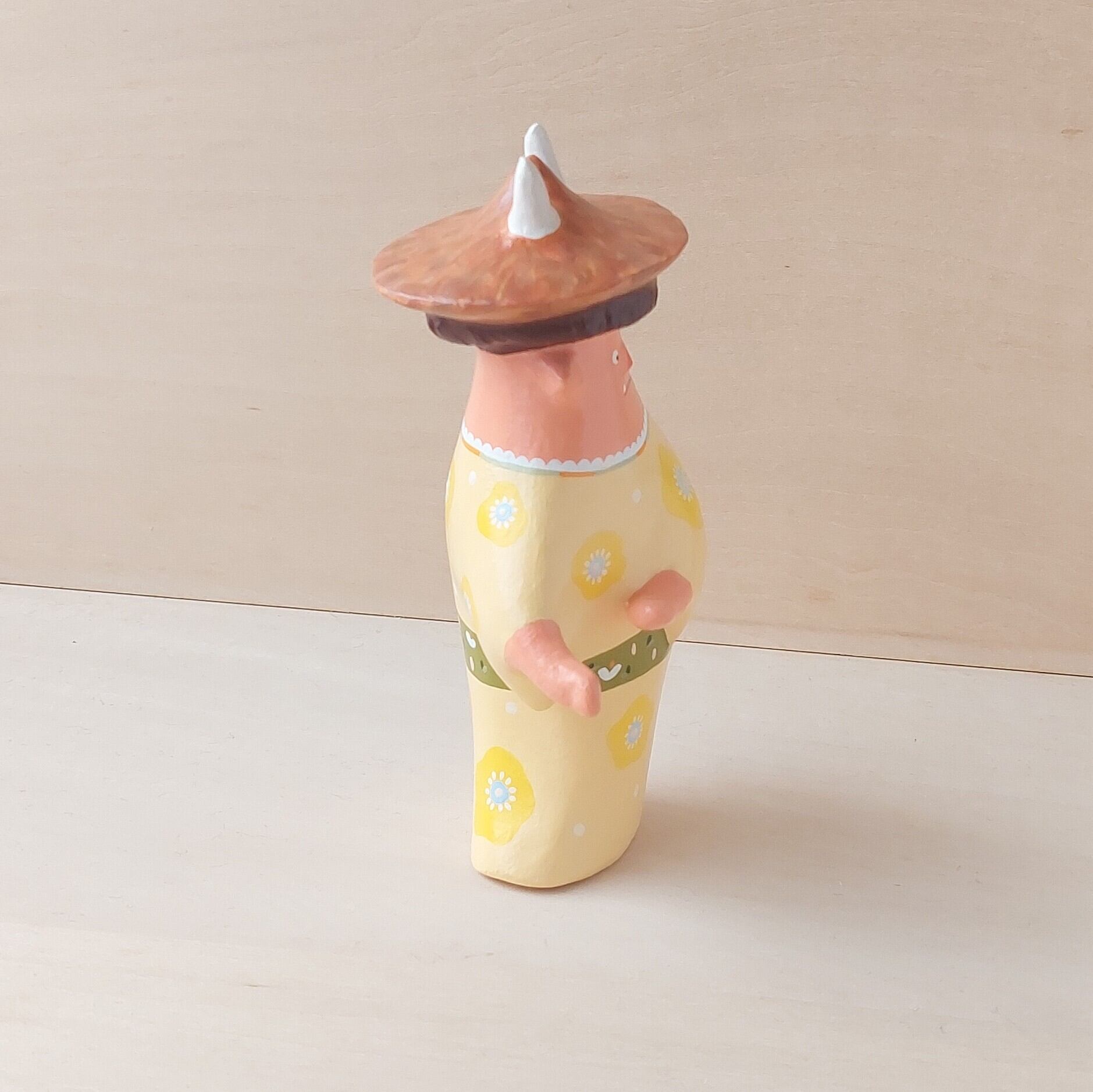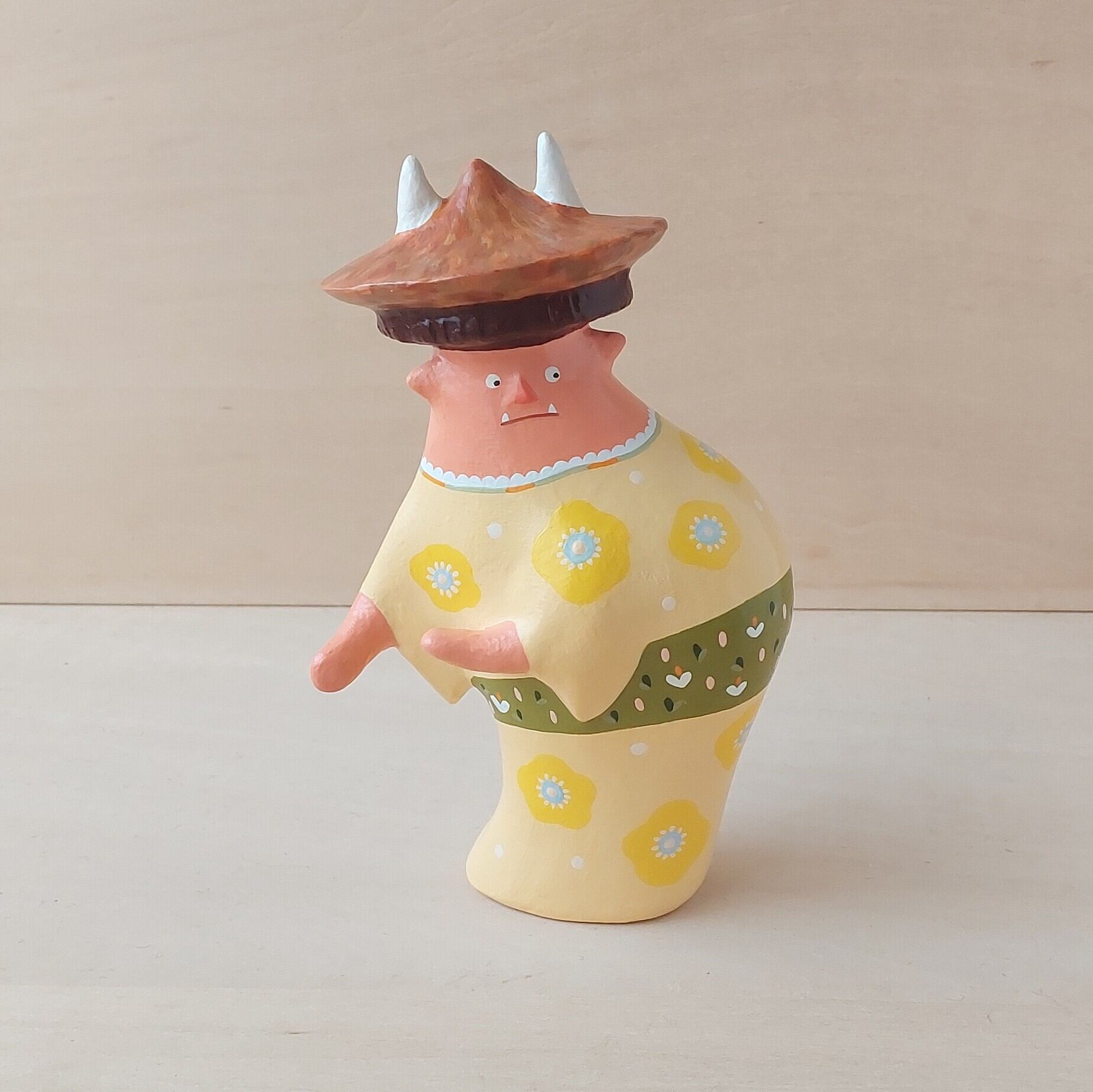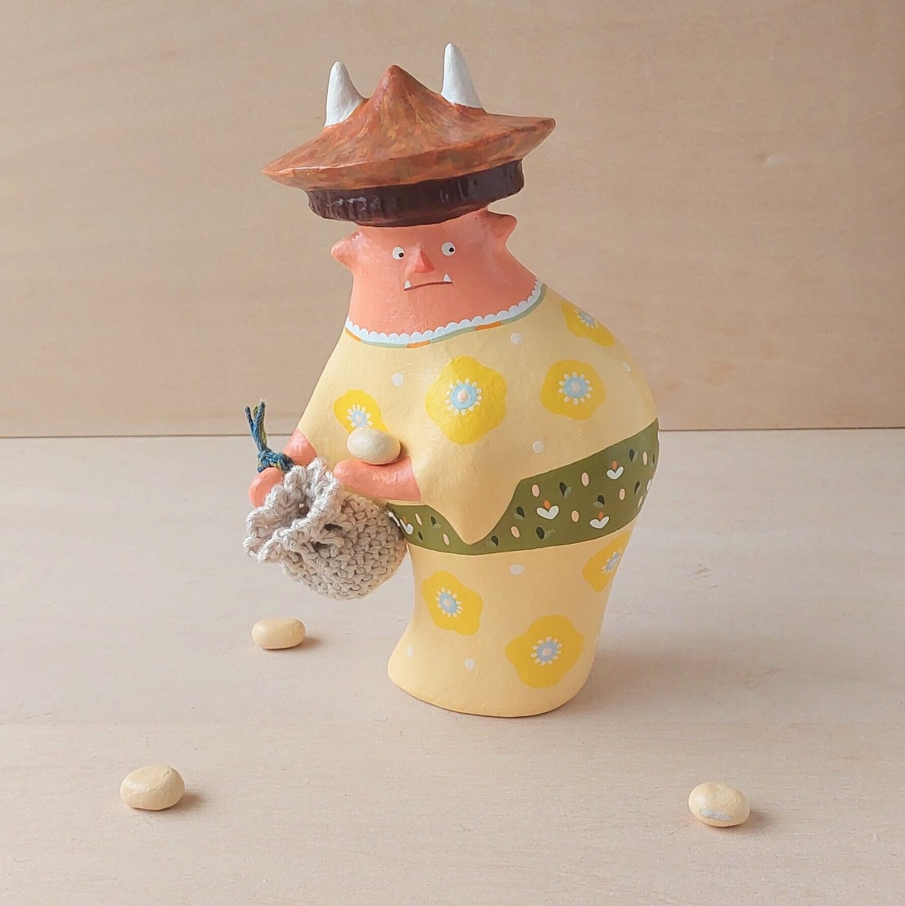 節分で投げられた豆をこっそり拾う小鬼。見つからないように様子をうかがう表情や豆を拾う背中が可愛くなるように仕上げました。拾った豆は毛糸で作られた袋に詰め込みます。節分のとき投げた豆の数より拾うときの数が減っていると感じたら小鬼たちの仕業かもしれません。