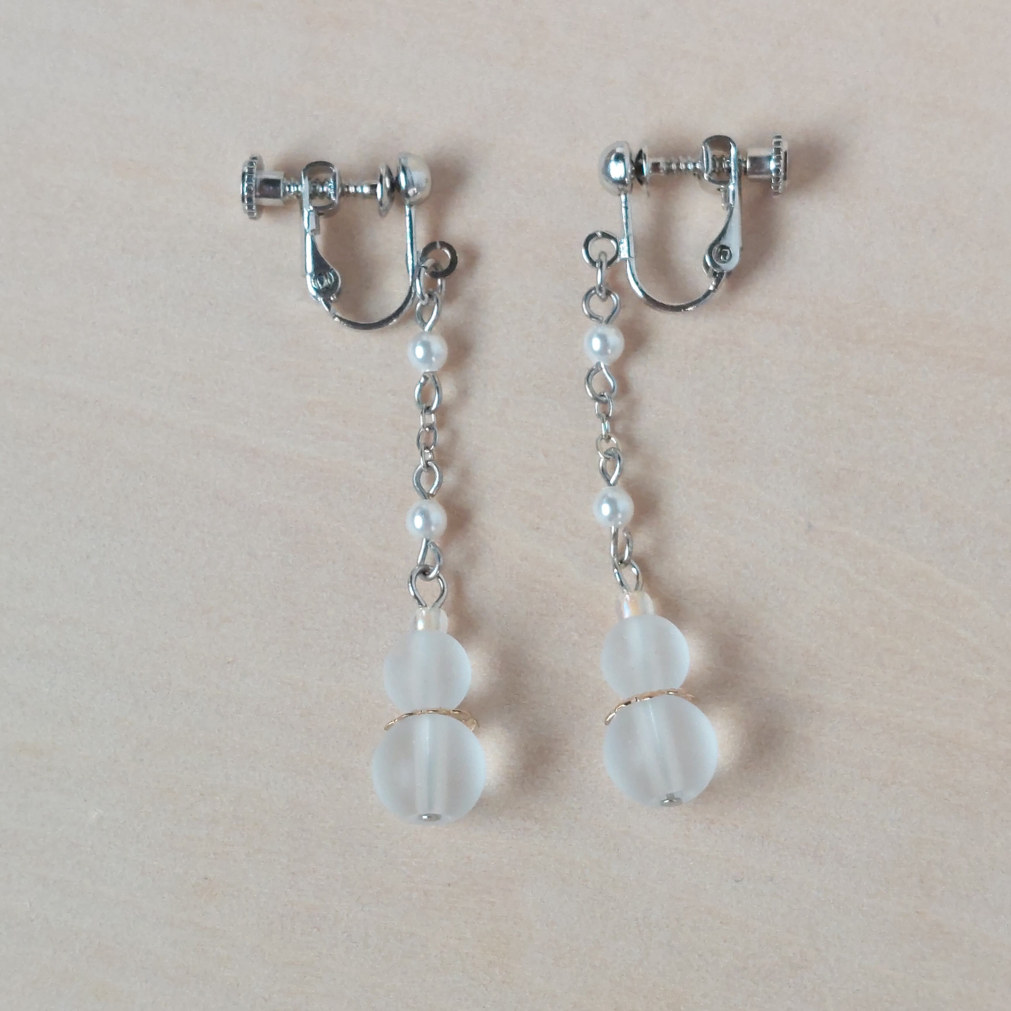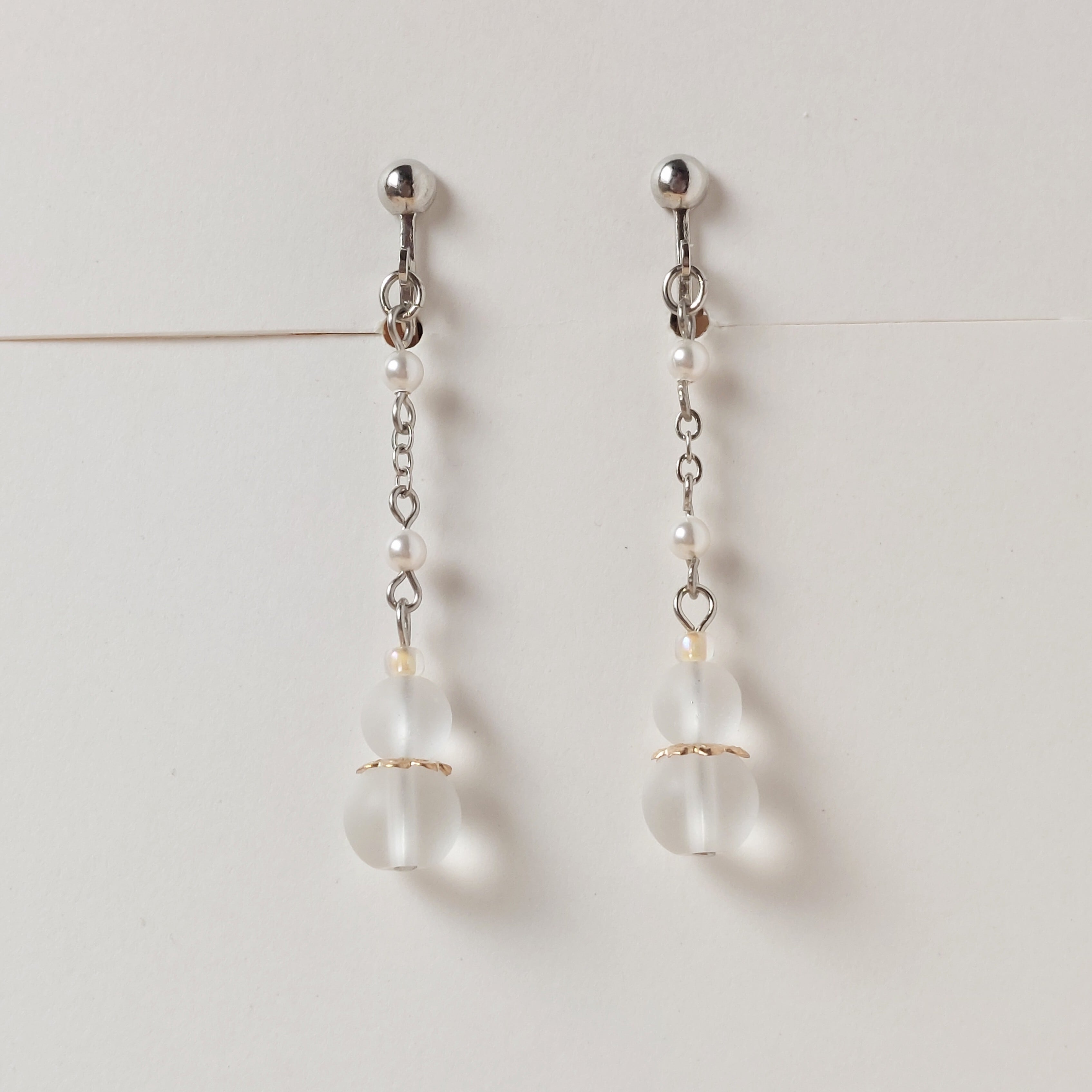 黄色の帽子をかぶった雪だるまをモチーフにしたイヤリング。パールビーズで雪がふっている様子を表現しました。