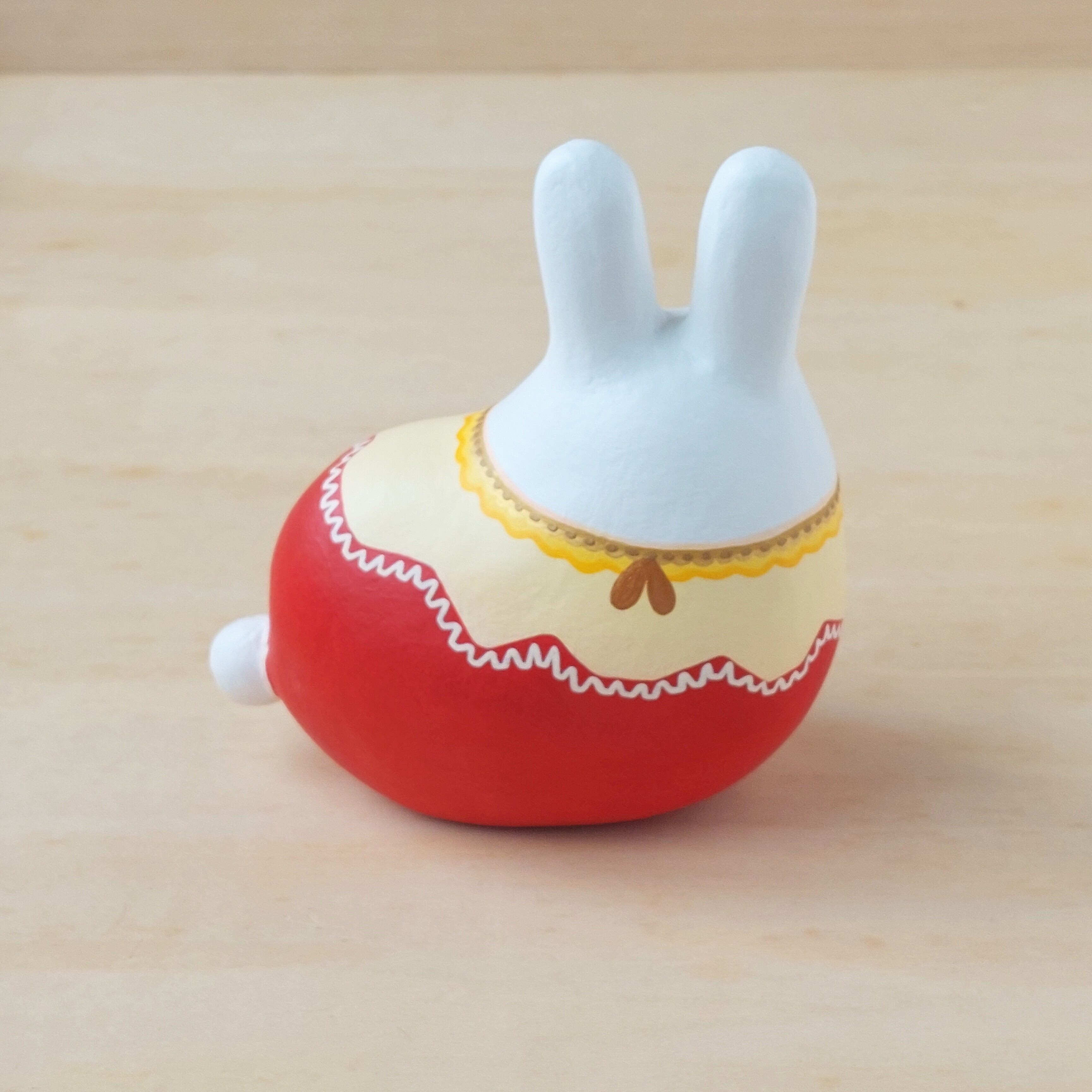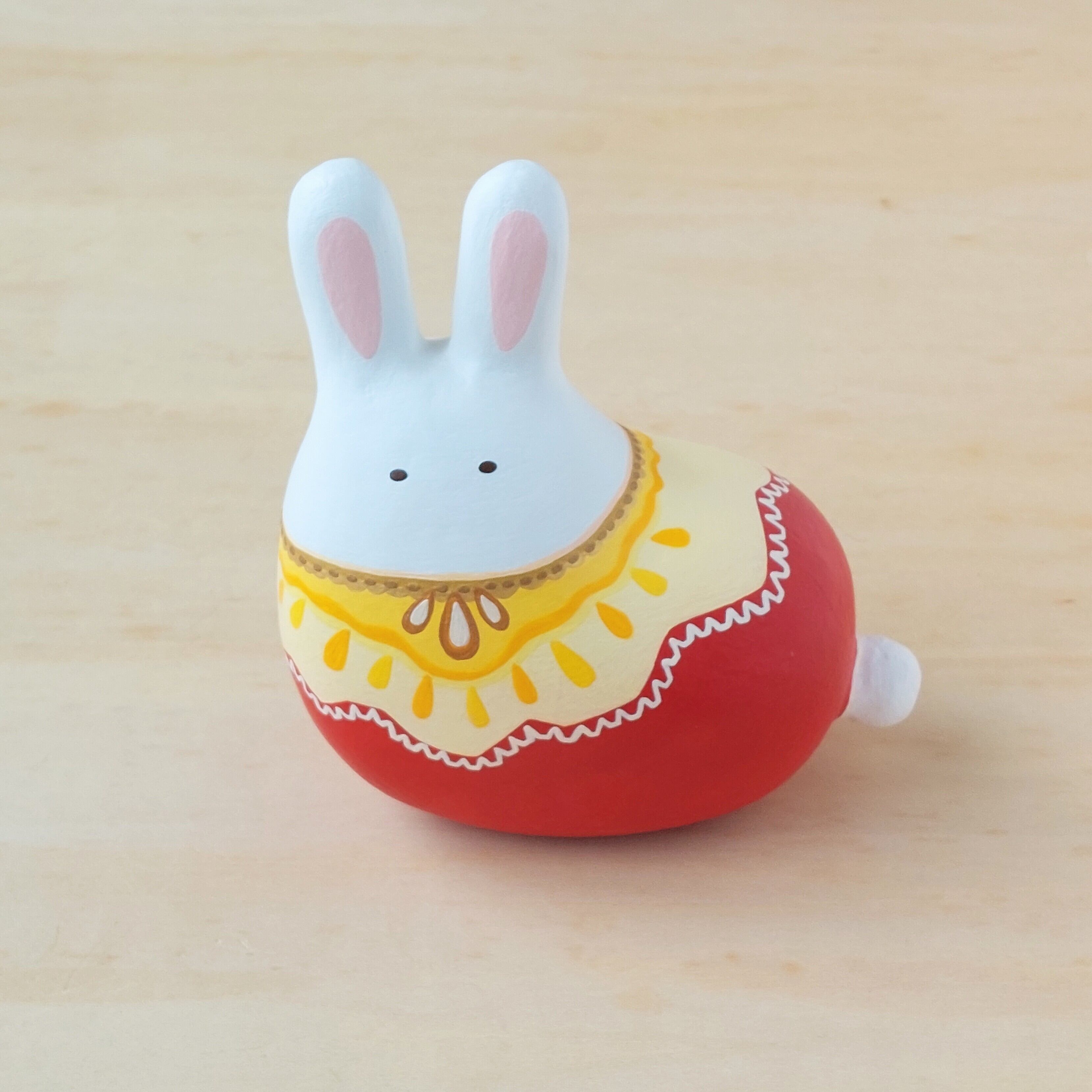 りんごモチーフの服を着たウサギ。