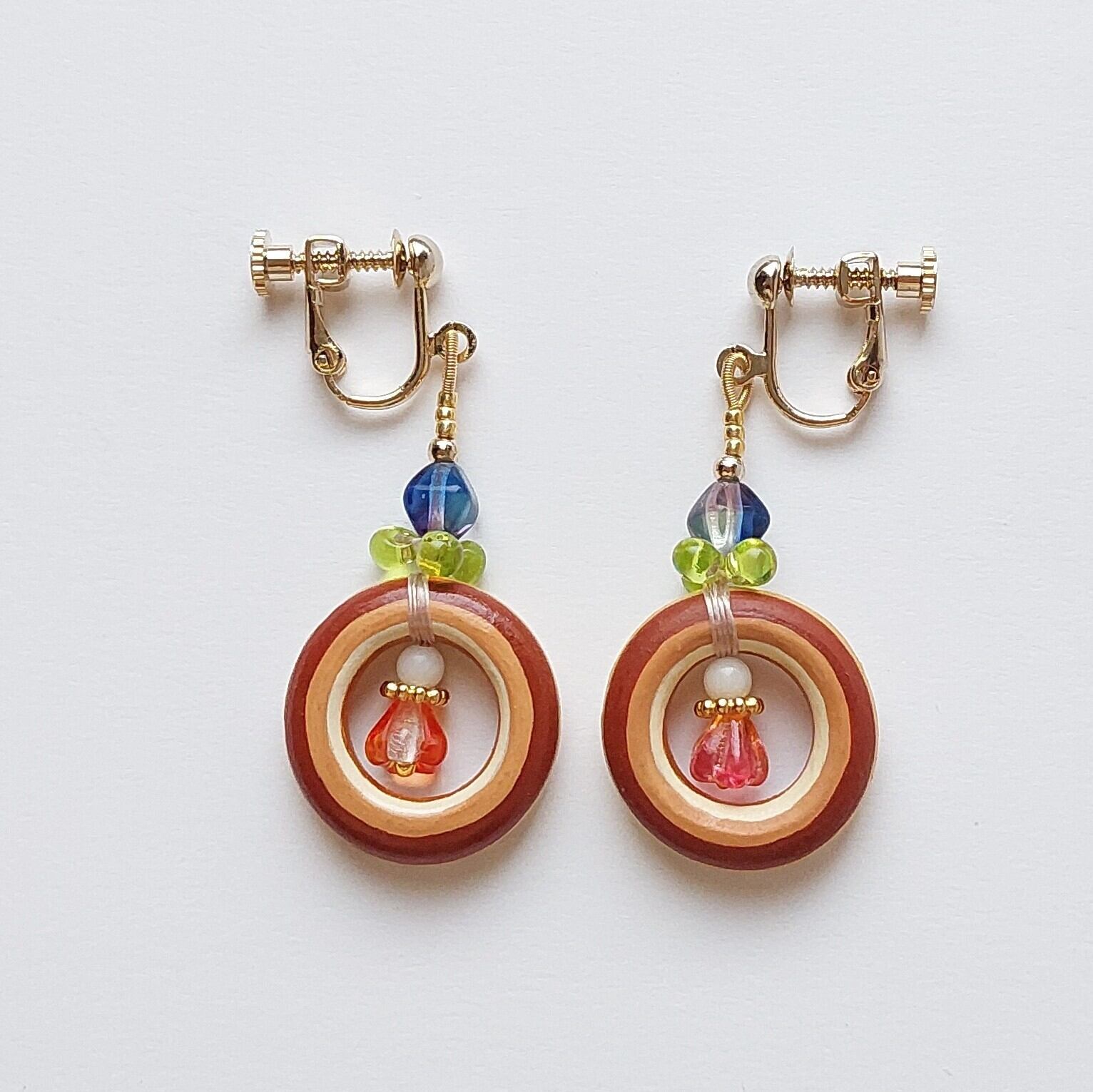 木製リングの絵は手描きで、てるてる坊主の頭には白珊瑚のビーズを使っています。耳につければリングといっしょにかわいく揺れます。花のモチーフもあしらって気分が晴れやかになるように思いを込めて作りました。